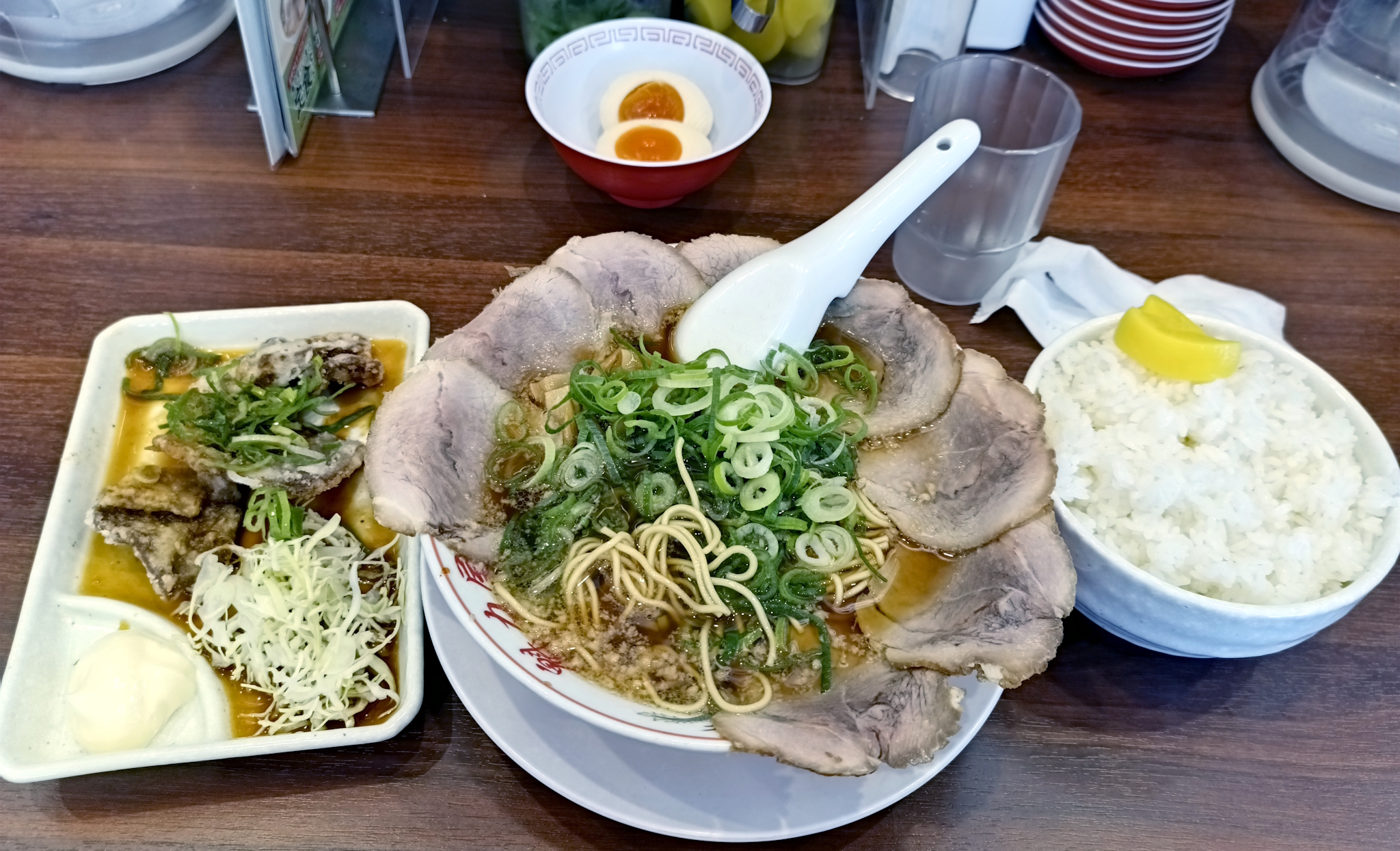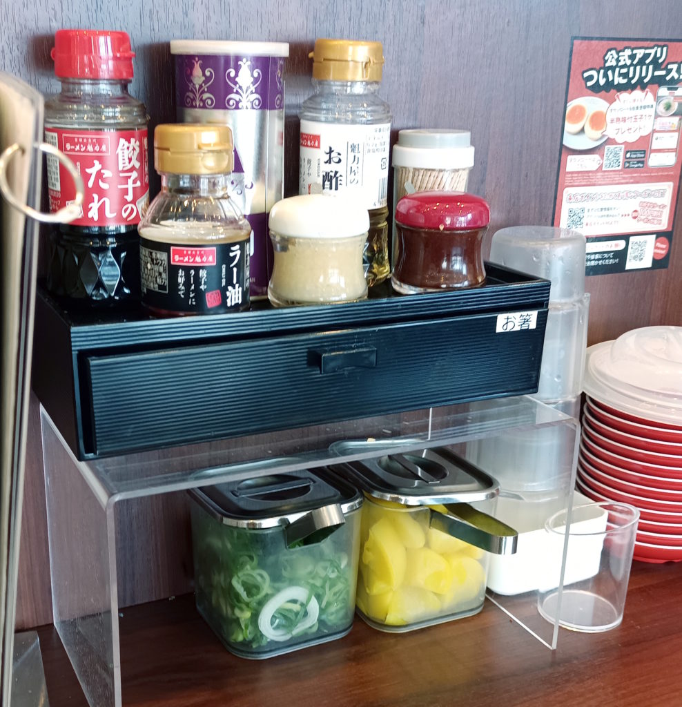 備え付けでネギ追加し放題(限度はある)、沢庵も食べ放題(限度w)で味変のラー油・ニンニク・コチュジャン?・お酢と選べる。